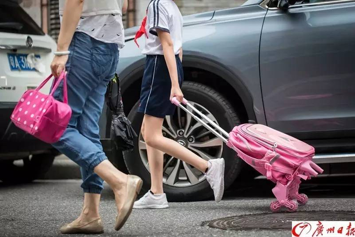 “妈妈,老师说开学不准带拉杆式书包回学校。”即将升上大沙头小学五年级的女儿小彤(化名)告知母亲黄女士(化姓),学校在新学期严禁拉杆书包出现在校园范围内。这可急坏了黄女士,她告诉记者,他们家住工业大道,平时家中老人接孩子放学,搭地铁也要1个多小时,十分不方便。