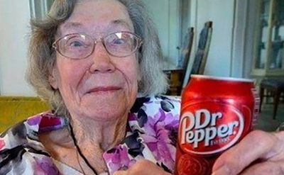 美国一位百岁老奶奶手拿碳酸饮料的照片上了社交媒体热搜。
