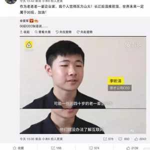 这位被雷军点赞的00后的创业者叫李昕泽,是洛阳崇才网络科技有限公司(以下简称崇才科技)的CEO。他不仅自称"中国首位00后CEO",还表示:“三四十岁的老一辈企业家,已经不理解互联网了,因为他们都老了。”