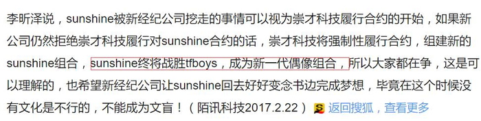 而另一次差点有进账的项目则是崇才为Sunshine开发一款粉丝APP,帮她们“炒作”扩大影响力。不过却因为执行方觉得崇才科技不靠谱而自己截胡了:“原本是想跟崇才合作,但接触下来,觉得崇才科技各种各样的东西让我觉得好好笑,现在我都不知道他们到底在做什么。”