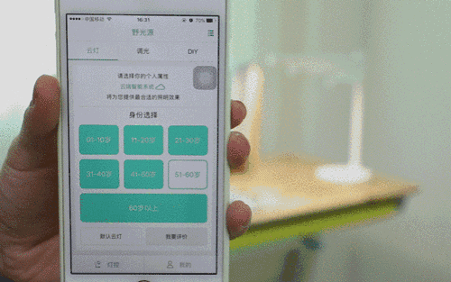 在手机APP里,进入“云灯”界面,选择所属年龄段。台灯会调到最适合该年龄段的自动光线模式。