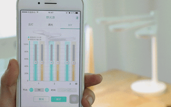 台灯和APP连接后,选择底座上方的“云健眼”功能,便开启了模拟自然光动态模式(也就是灯光自动变化模式)。