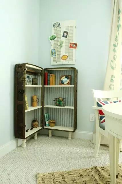 把行李箱里面做好隔层,挂于墙上,一个立式储物柜就诞生了,实用而特别。