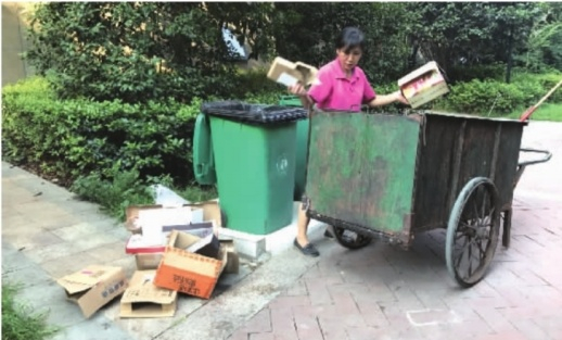 当问及物业是否要求保洁人员对垃圾进行分类处理时,他表示并没有这样的要求,个别保洁分类也只是将可卖物挑出自行变卖。“一方面是因为有的居民并没有做到垃圾分类,导致垃圾又混在了一起。另一方面是因为运送垃圾的垃圾车就是一个大空间,没有分类空间。还有就是垃圾中转站也没有垃圾分类放置设备,所以就算分类运输了,到垃圾站也还是要混合堆积的。”