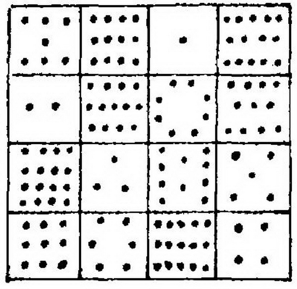 值得一提的是,为了向外星文明表现地球人今日的智慧水平,“金色唱片”的图片里还有一张4阶完美幻方图。这个幻方,是由1-16这16个数字排出的图阵,因为“宇宙人”不太可能认得我们的阿拉伯数字,数字是用点子表示的。这个图阵是地球人高度智慧的产物,具有非常奇妙的特性:它的每行每列、两条对角线上的4个数字之和,都等于34;如果把两个这样的幻方拼起来,那么每条次对角线上的4个数之和,也都是34。