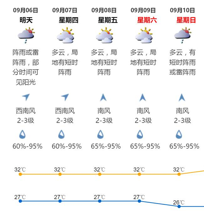 今日天气:阴天间多云,有阵雨,午后可见阳光;气温26-32℃;西南风2-3级;相对湿度65%-95%