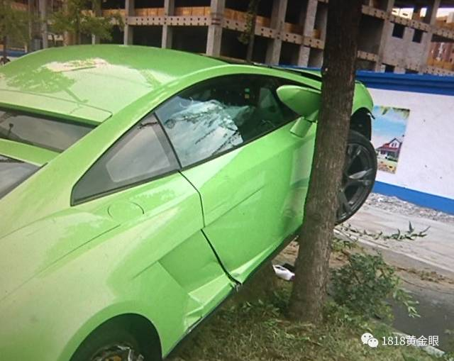 这辆绿色的兰博基尼,车头直接冲上路边绿化带,爬上了绿化带中的树丛,车头部分零部件散落一地,车的保险杠整个脱落,右后轮轮毂和右侧车门都有严重损坏。
