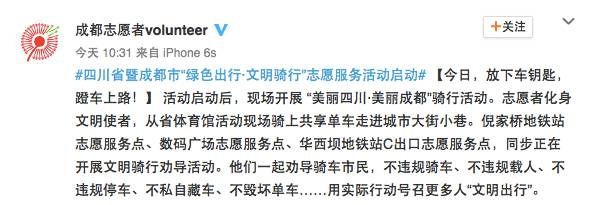 昨日,四川省暨成都市“绿色出行·文明骑行”志愿服务活动正式启动。活动现场发布了“绿色出行·文明骑行”倡议书,已进入成都市场的7家共享单车企业积极响应绿色出行,同步利用自身平台发放免费骑行券或免费骑行。