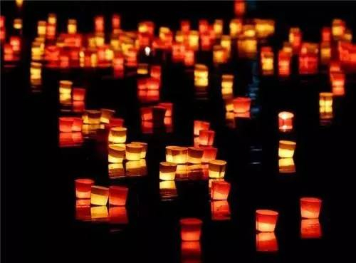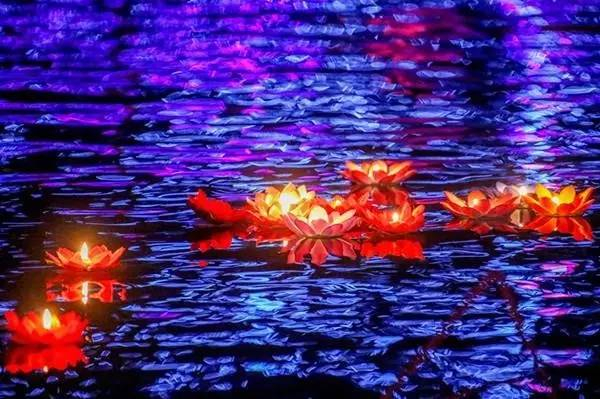 河灯也叫“荷花灯”,河灯一般是在底座上放灯盏或蜡烛,中元夜放在江河湖海之中,任其漂泛。放河灯的目的,是普渡与祈祷。放河灯,尤数黄河里放灯壮观。