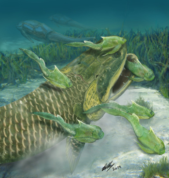 鸿鱼生态复原图,在泥盆纪古湖泊中与宁夏鱼和桨麟鱼相伴(Brian Choo绘)