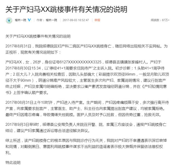 8月31日20时左右,在榆林市第一医院绥德院区妇产科一名孕妇从5楼分娩中心坠下,医护人员及时予以抢救,但因伤势过重,抢救无效身亡。