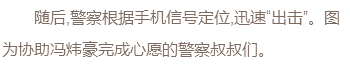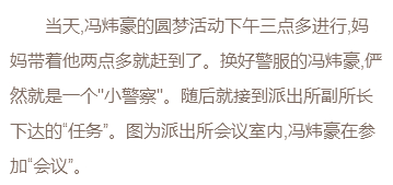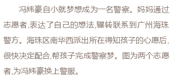 据悉,这次圆梦行动,南华西派出所出动了十几名警察,此外还有社会上的志愿者叔叔阿姨。让冯炜豪妈妈颇为感动,也让现场很多人倍感温暖。