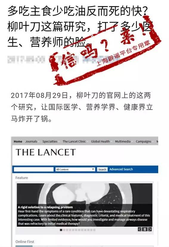 近日,一篇题为《多吃主食死的快?柳叶刀的最新研究,打了多少医生、营养师的脸》公众号文章在朋友圈疯传。