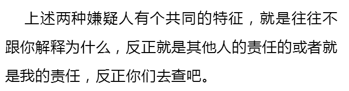 这种嫌疑人一开始就把自己打扮成一个被害人的形象,不断强调办案机关违法办案,刑讯逼供等,但是在问及具体如何刑讯,如何违法,却往往拿不出具体的证据,也给不了具体有用的线索,或者只能将一些似是而非的程序问题无限扩大,希望用程序来推翻对自己不利的证据。