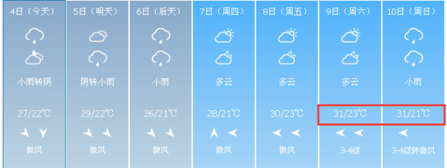 4号夜里到5号白天:阴天到多云,部分地区阵雨,西北风2~3级,22~28℃。