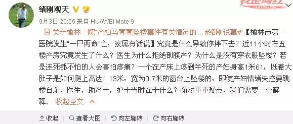 9月3日 10:52 ,榆林市第一医院在其微博官网@榆林一院 发布了:我发表了头条文章:《关于产妇马XX跳楼事件有关情况的说明》