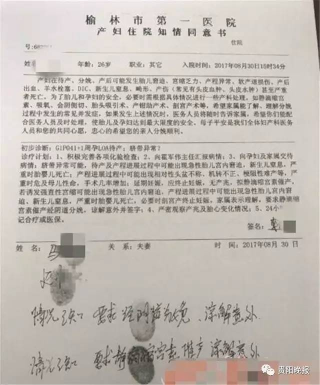 9月4日下午,在家属签字的《产妇住院知情同意书》上,华商报记者看到,产妇马某、其丈夫延某分别在该同意书上签字并按了手印,同时其丈夫延某在后面写有“情况已知,要求经阴道分娩,谅解意外”、“情况已知,要求静滴缩宫素催产,谅解意外”,并在后面签字按手印。