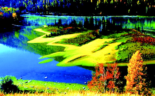 阿尔山的秋天是金色的,金闪闪的阳光照在开始发黄的树叶上,给这些树的叶子都镶上了一层金色的边,把阿尔山的秋天变成了一个金色的童话世界。