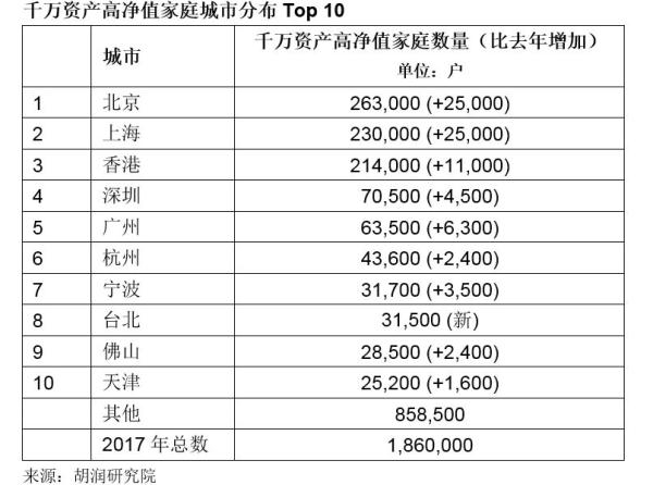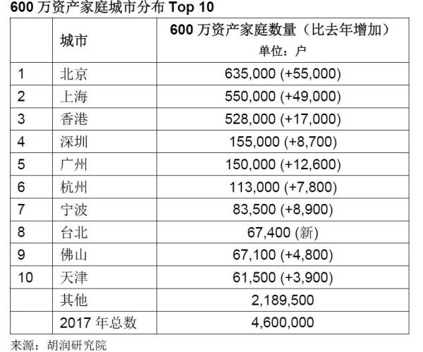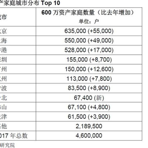 9月5日,胡润研究院发布《2017胡润财富报告》,统计中国拥有600万资产、千万资产、亿万资产和3000万美金资产国际超高净值的家庭数量和地域分布情况。