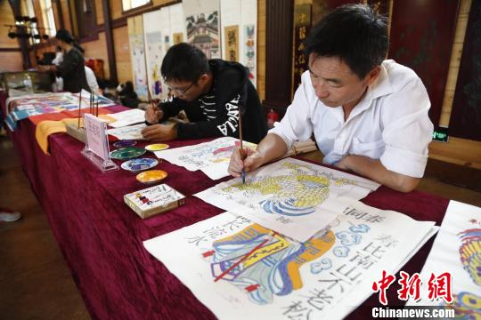 泰安市泰山区邱家店镇高家庄的市级非物质文化遗产徐家庄木板年画传承人王连洋带着儿子,在现场制作木板年画。 陈阳 摄