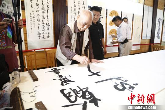 泰山五老之一的书法家董绪忠现场泼墨。 陈阳 摄