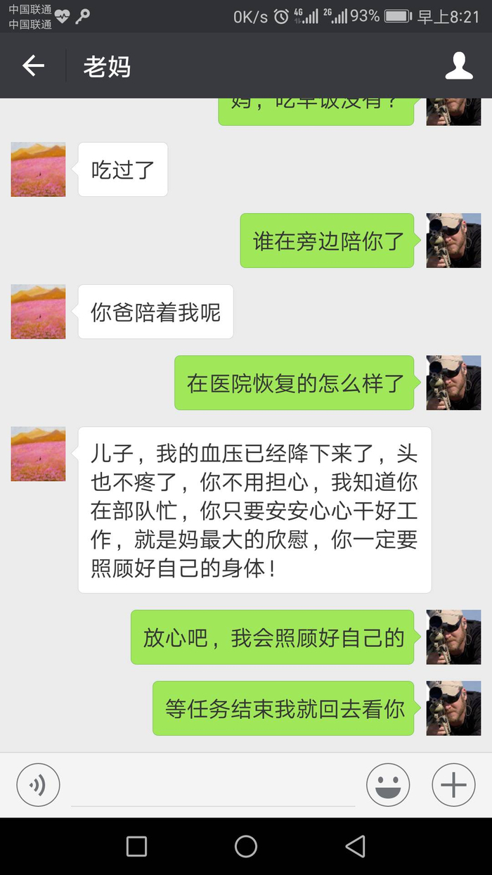 儿子,我的血压已经降下来了,头也不疼了,你不用担心,我知道你在部队忙,你只要安安心心干好工作,就是妈最大的欣慰。你一定要照顾好自己的身体。