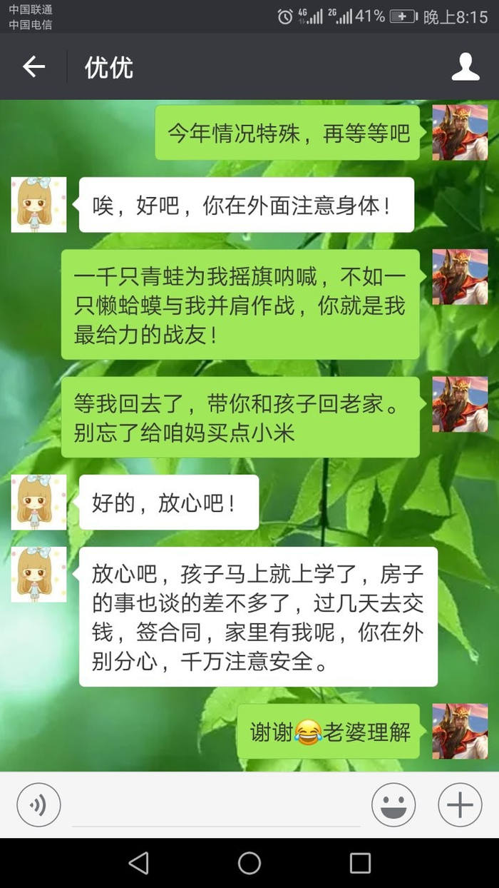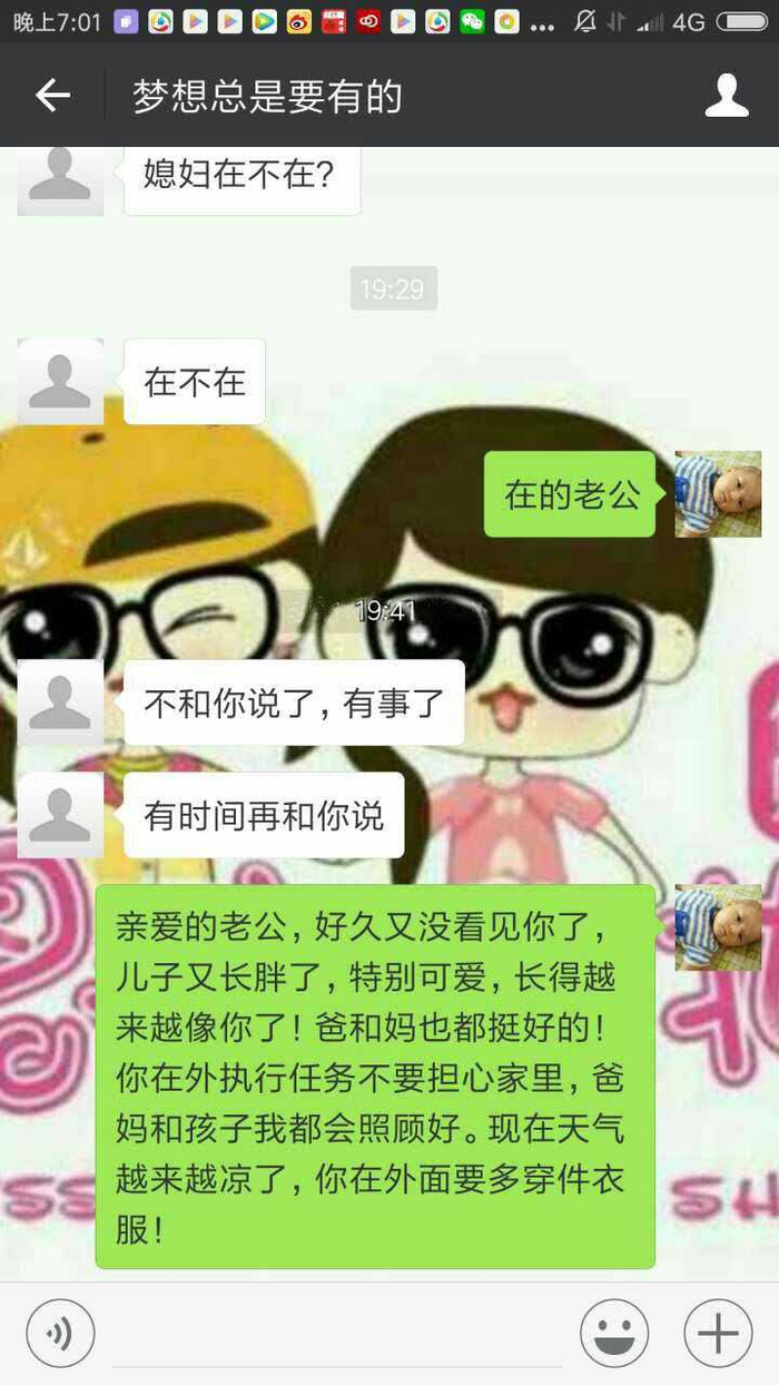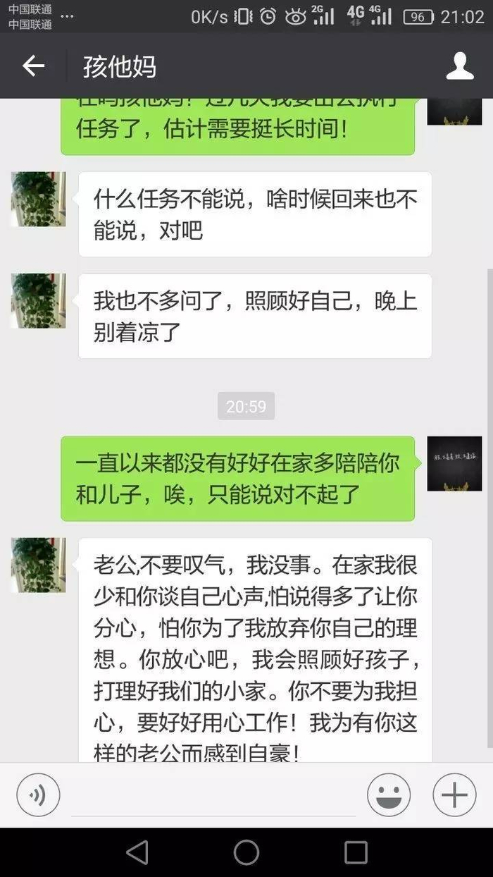 你在外执行任务不要担心家里,爸妈和孩子我都会照顾好的,现在天气越来越凉了,你在外要多穿件衣服。