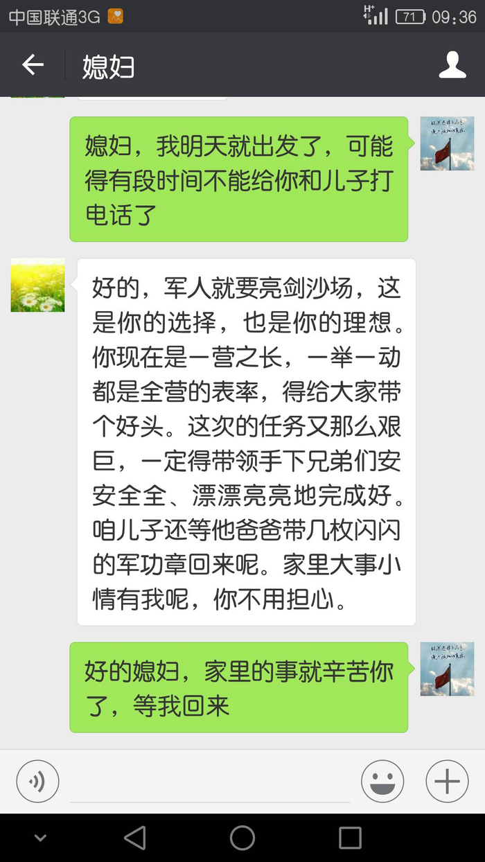 军人就要亮剑沙场,这是你的选择,也是你的理想。你现在是一营之长,一举一动都是全营的表率,得给大家带个好头。这次的任务又那么艰巨,一定得带领手下兄弟们安安全全、漂漂亮亮地完成好。咱儿子还等他爸爸带着闪闪的军功章回来呢。