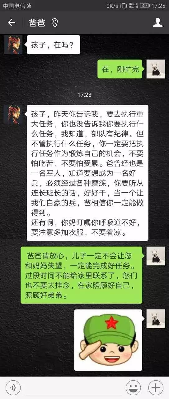 你一定要把执行任务作为锻炼自己的机会,不要怕吃苦,不要怕受累。爸曾经也是一名军人,知道要想成为一名好兵,必须经过各种磨练,你要听连长班长的话,好好干,当一个让我们自豪的兵,爸相信你一定能做得到。