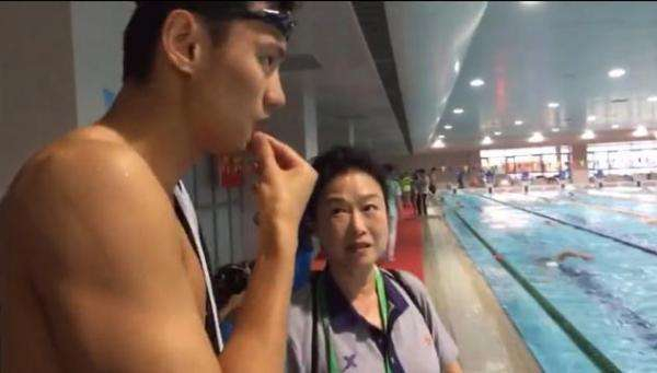浙江队的徐国义教练走到他跟前,祝贺着他。徐国义用力握着宁泽涛的手,说着“加油”,而不远处,朱志根教练也微笑着看着这一幕。