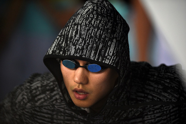 一做完赛前的按摩,宁泽涛就会把衣服的帽子戴起,再把耳机插进耳朵里。不停有选手从旁边走过,他就坐在一个不算起眼的小角落里,没有人知道,他到底在想什么。