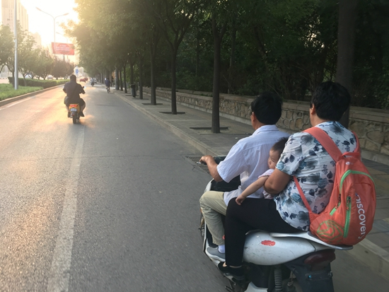黄昏如期而至,陈显兰和老伴在电动车上,两个衰老的躯体把一个熟睡的新生命夹在中间,缓慢地朝夕阳驶去。