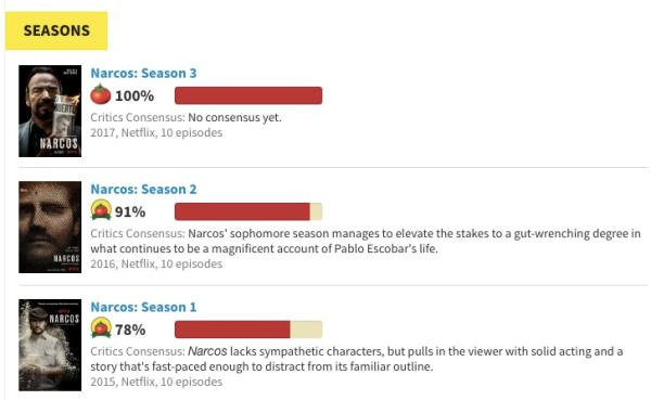 烂番茄网站上,《毒枭》三季评分,目前第三季评分高达100%,不过一般按照规律,随着打分人群的增加,评分会呈下降趋势。