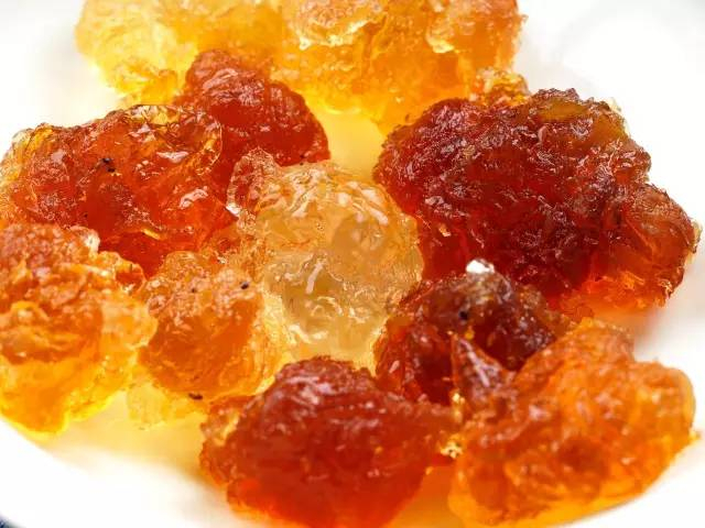 它是桃树分泌的树脂,经过天然日晒后形成的。晒干后的桃胶,外观看起来像块儿漂亮的琥珀。