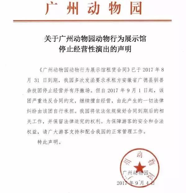 对此,广州动物园4日连发两份声明称,园方与马戏团是租赁关系,双方合同本应8月31日到期,园方也很早就给马戏团发送了通知书。但合同到期后,马戏团仍在违约经营,严重违反合同约定。