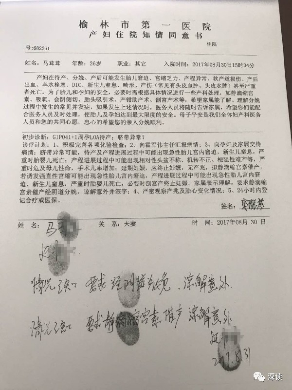 杨先生说,产妇住院当天院方就开具了《产妇住院知情同意书》建议进行剖腹产,但家属不同意,还签字了。
