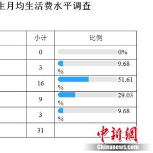 在西安,记者随机对大学生进行调查发现,月生活费在1000元到1500元的学生占比最多。在接受采访的31名学生中,有16名学生的月生活费在这一区间内。月生活费在1500元到2000元的学生有9人,500元到1000元(含1000)以及2000元以上的学生各有3人。