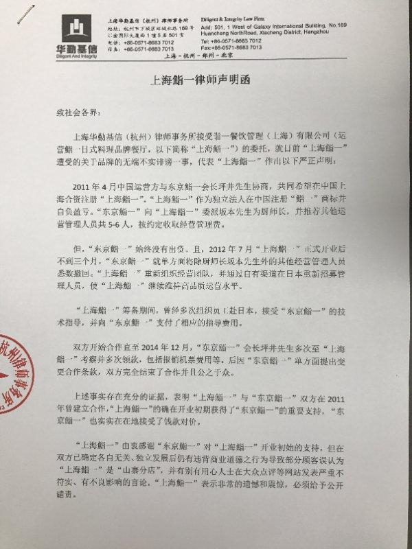 上海鮨一官网发布的声明。