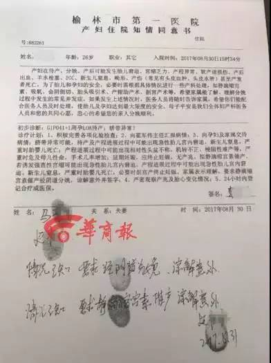 9月4日下午,在家属签字的《产妇住院知情同意书》上,华商报记者看到,产妇马某、其丈夫延某分别在该同意书上签字并按了手印,同时其丈夫延某在后面写有“情况已知,要求经阴道分娩,谅解意外”、“情况已知,要求静滴缩宫素催产,谅解意外”,并在后面签字按手印。