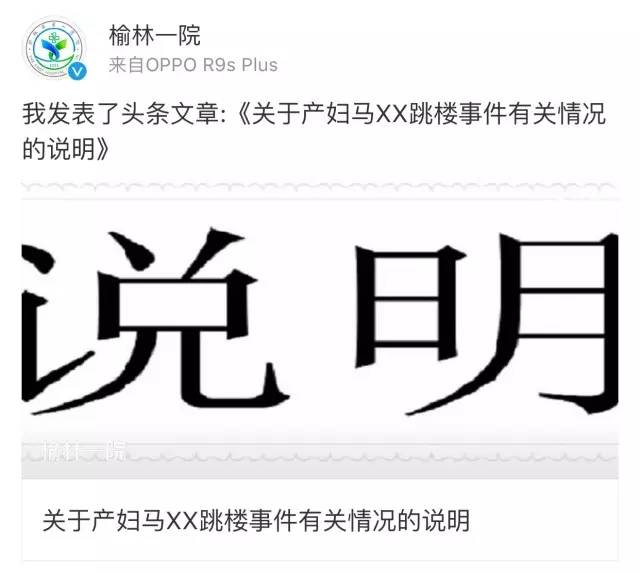2017年8月31日,我院绥德院区妇产科二病区产妇马XX跳楼身亡,随后网络出现相关不实网帖。为正视听,现就有关情况说明如下:
