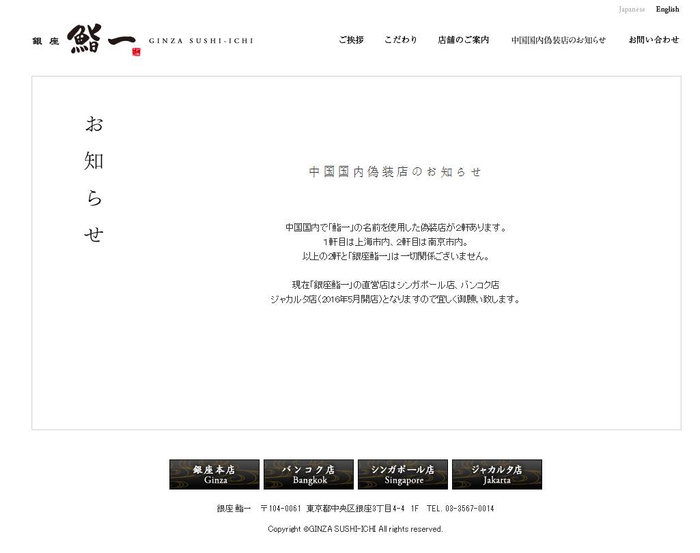 原文翻译为:在中国国内,以“鮨一”为名字使用的山寨店铺有两家。一家在上海,一家在南京。上面两家店和“银座(东京)鮨一”没有任何关系。现在“银座(东京)鮨一”的直营店是新加坡店、曼谷店和雅加达店(已于2016年5月关店)。