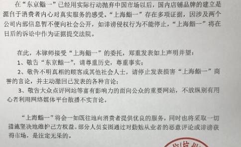 新民晚报新民网记者就此事联系了上海“鮨一”创始人,曾担任店长的郭女士。她向记者表示,“东京鮨一”的声明与事实不符,目前已经向对方发去律师声明函。