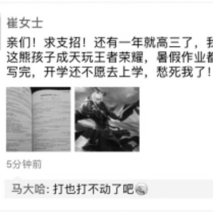 本报讯(华商晨报主任记者 刘桐)暑假中学生们都干什么啦?开学后,学生在说完成作业的同时,很多学生都会谈到“王者荣耀”。 昨日,崔女士就在微信朋友圈中晒出了儿子玩网游的截屏,还有一张没完成的作业图片:“还有一年就高三了,我家这熊孩子成天玩王者荣耀,暑假作业都没写完,开学还不愿去上学,愁死我了!” 发出朋友圈后,引来了许多“同病相怜”家长们的围观,不少人也在反映自家熊孩子的问题。 孩子假期玩王者荣耀常到凌晨 新学期开学已经第三天了,崔女士的儿子张熙(化名)还没从暑假生活节奏中调整出来。前一天晚上张熙还沉浸在王者荣耀的网络游戏中不能自拔,第二天不愿意起床,甚至还说“不想去上学!不参加高考也行”之类的话。 儿子这话对崔女士简直就是晴天霹雳,“常说玩物丧志,没想到自己孩子成为这样不上进的人。” 结果发出朋友圈后,引来了许多“同病相怜”家长们的围观,不少人也在反映自家熊孩子的问题。一位网友将崔女士的烦恼发送给了本报官方微信,想通过本报获得更为专业的解决方法。 假期结束后不愿上学 昨日,记者联系到崔女士本人。崔女士说:“我儿子是重点中学的学生,开学就高二了,学习成绩中游水平,班主任老师说假期抓一抓学习,高二很关键,如果冲上去高三再稳定住,就能考上一个还不错的大学,要是高二水平下来,这成绩可就没法保证了。” 但崔女士没想到的是,暑假期间,儿子张熙却以学习紧张,假期适当放松为由,和班级同学一起玩上王者荣耀的网络游戏。 “从此孩子就不能自拔,每天自己在屋子里面玩游戏,从早上我出门一直到晚上下班还在玩,甚至常常直到凌晨还沉浸其中。这两天精神也是萎靡不振。我要是说多了,就一摔门进屋了。要是问急眼了,就说我不去上学了,不参加高考也能挺好,现在就想去当导游,挺自由的!”崔女士焦急地说。 ■对话家长 孩子视力下降 打不起精神学习 采访中,家长崔女士一直表现得很焦灼,甚至还抱怨:“这孩子就是不争气,还有就是王者荣耀可把孩子们都坑了!” 记者:什么时候发现孩子在假期玩王者荣耀的? 崔女士:之前我儿子也上网看看新闻、视频、电影,偶尔会玩会儿网络游戏,但是玩一会就放下不玩了。 在今年暑假刚开始,我儿子经常傍晚和同学约好打篮球,可能就是这个时候他同学向他介绍了王者荣耀这款网络游戏。开始的时候白天还能看书做题,也就是晚饭后才会玩一会儿,他说是学习时间长了,换换脑子,放松一下。后来就沉浸其中,不能自拔。 每天我早上出门上班前,看到他起来就坐在电脑前玩游戏,下班回来的时候还是坐在那里一动不动的玩。甚至我早上做完的饭摆在桌子上,他一筷子都没动,一天都不吃饭,就在那里玩。 记者:对于孩子沉迷于网游的情况,有没有和孩子谈谈心?或者带着孩子干点其他事儿转移注意力? 崔女士:每当看到他玩网络游戏的时候,我就气不打一处来,既着急又生气。后来他更夸张,嫌在电脑前玩游戏我总说他,就开始用手机继续玩。他倒是能够坐在书桌前,但是根本没学习,而是低头专心玩游戏,令我感到很“揪心”。 开始我和他谈,他还能停一会儿应付应付我,但是后来对我不太爱搭理了,总说“就这一局,玩完了再看书”,但是这一局却没完没了。现在我要是说他,他还会很逆反地怒怼我。开学前,我还带着他去浑南的省科技馆、博物馆参观,但他一路上一直闷着头玩手机游戏。 记者:孩子玩网络游戏后,都有哪些变化? 崔女士:现在孩子性情大变,只要一提到别玩游戏,就成为我们母子俩的“火药桶”,基本上是一提就着。 孩子身体上也有变化,之前就有点轻微近视,现在经常因为眼睛干涩揉眼睛,还总是眯着眼睛看人,视力也出现下降的趋势。还有就是一个假期花费增多,之前儿子那点“小金库”的钱基本花差不多。后来还说谎,说约好和同学要买一双球鞋,向我要钱。后来我看他手机微信钱包中前后转账近2000元,估计都去给网游装备充值了。 如果只花点钱而不耽误学习还行,关键是现在开学也打不起精神,常说不想上学参加高考了,这哪像是即将上高三,准备高考的样子。 这两天开学后,老师准备收暑假布置的练习册作业,可是他基本没写,全都是空白页,这可咋办! ■对话孩子 控制不住自己 觉得没法面对老师 崔女士的儿子张熙对于记者的电话采访非常抵触,不愿多谈。 记者:你是啥时候接触这款游戏,怎么就这么吸引你? 张熙:现在同学都爱玩这款游戏,我也是被同学在假期补习班上拉进这个团队,为方便大家在游戏线下沟通,我们还组建了不同的微信群,还得定期交流。 这网游和之前的都不一样,玩上就根本停不下来,你的队友也不会让你停下来。要是输了肯定不会甘心,非得翻盘;要是赢了也都想趁势再多捞两把。 记者:玩游戏的时候就没想到要克制一下? 张熙:起初确实是想在紧张劳累的学习之余放松放松,还能和朋友们在游戏中玩一会儿,当成一种生活中的调味剂。后来确实我也不想玩,但是已经无法自拔。 就是在假期补习班上,我们也是背着书包早早赶到,然后在课堂外等候的时候,我们几个人就会撂下书包,然后开始交流游戏的得失,接着就是掏出手机一起“开黑”。 记者:现在为何不愿意上学? 张熙:虽然我也想尽量克制,但是还会时不时掏出手机玩网游。现在暑假留的练习册基本没写,上课也有点跟不上。 刚放假的时候,我制定了一