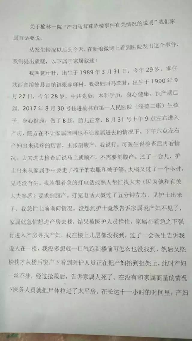 2017年8月31日,我院绥德院区妇产科二病区产妇马XX跳楼身亡,随后网络出现相关不实网帖。为正视听,现就有关情况说明如下: