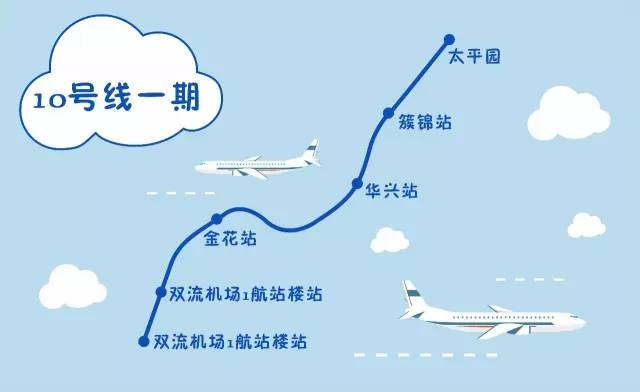 10号线一期起于太平园站,止于双流国际机场2航站楼站,线路全长10.9km,全段为地下线,共设车站6座,由北向南依次站点为太平园站、簇锦站、华兴站、金花站、双流机场1航站楼站、双流机场2航站楼站。目前坐地铁前往机场,可通过3号线抵达太平园站并进行换乘,前往双流机场航站楼。