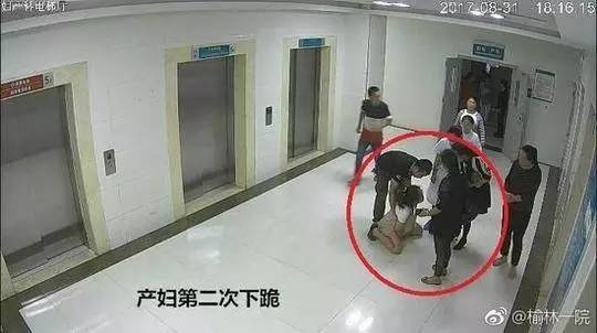 根据榆林市第一医院公布的监控录像截图,8月31日下午6点09分和6点16分,马女士曾先后两次在产房外跪地,身后搀扶者疑似为其丈夫延先生。晚上7点20分左右,马女士再次走出产房,从截图上看,当时马女士、延先生和一名医护人员正在交流。