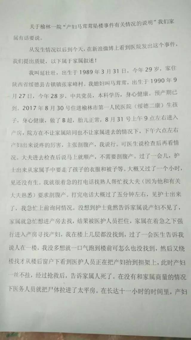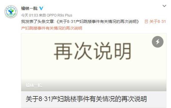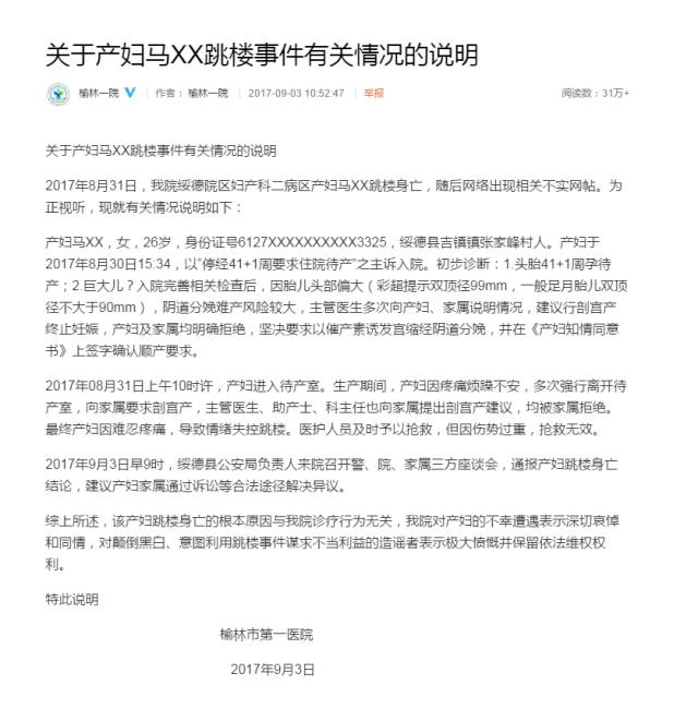 事发后,涉事医院陕西榆林市第一医院绥德院区针对此事第一时间发表了声明称:产妇(马某)生产期间,因疼痛烦躁不安,多次强行离开待产室,向家属要求剖宫产,主管医生、助产士、科主任也向家属提出剖宫产建议,均被家属拒绝。最终产妇因难忍疼痛,导致情绪失控跳楼。医护人员及时予以抢救,但因伤势过重,抢救无效。