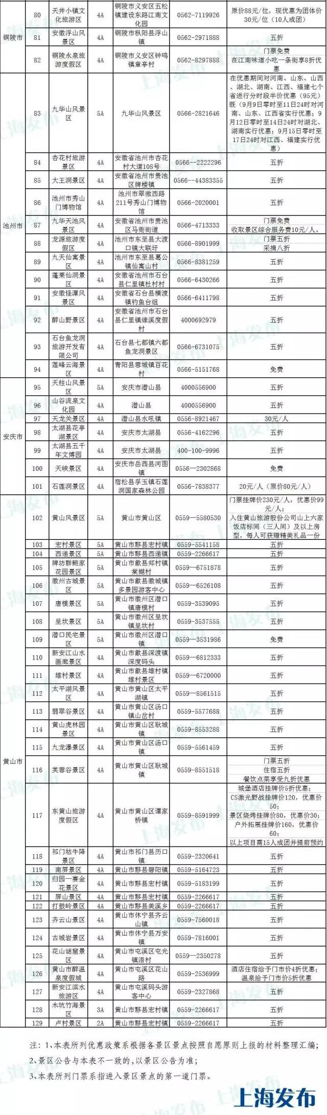 优惠内容:安徽11家5A级旅游景区、100多家4A级以上旅游景区挂牌价5折以上特价或免费