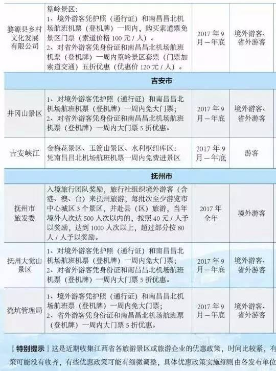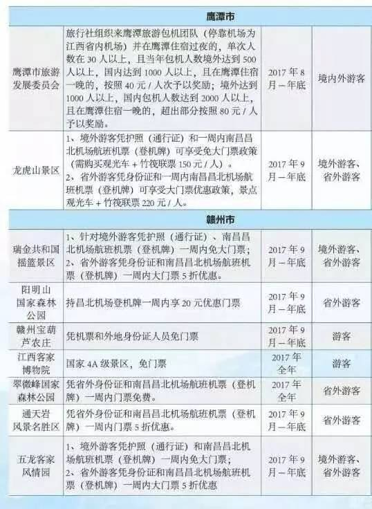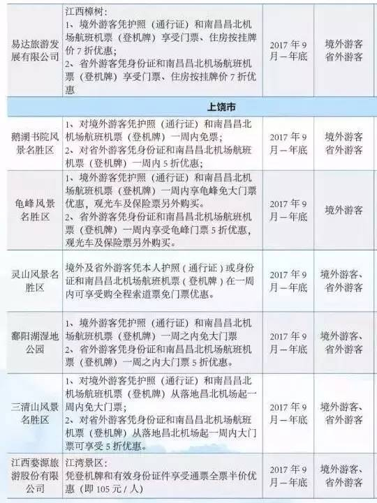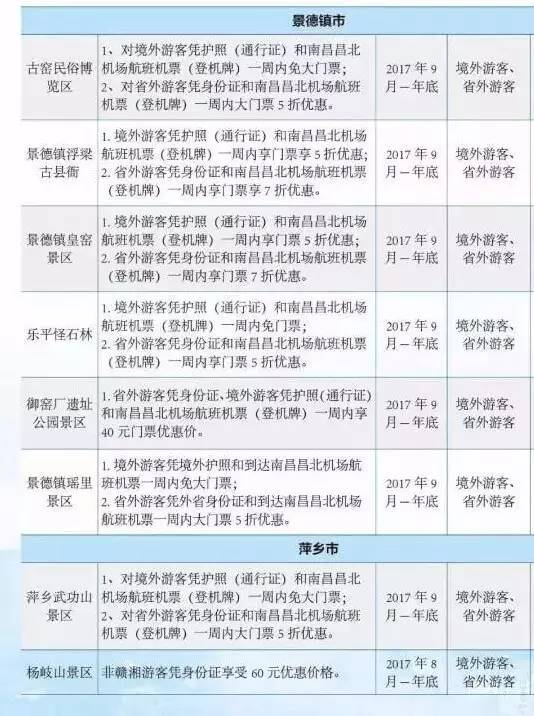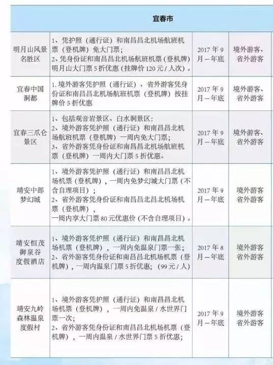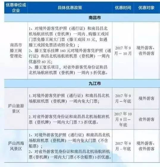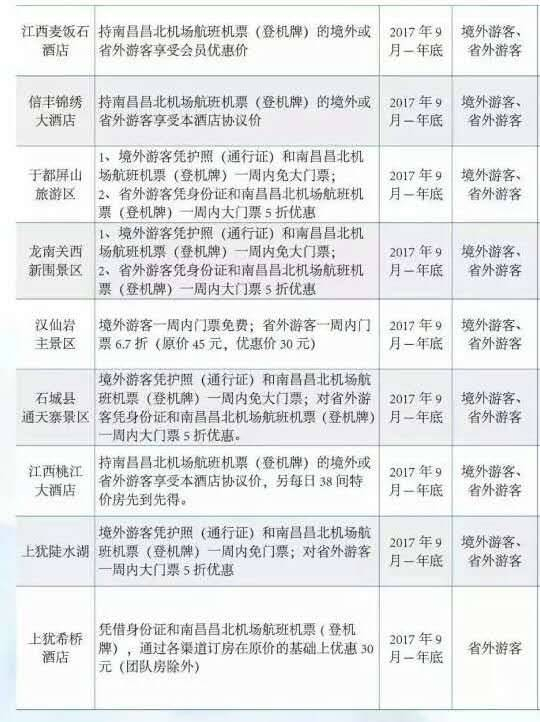 优惠内容:全省5A级旅游景区、部分重点4A级旅游景区对境外游客凭国外护照(通行证)和南昌昌北机场航班机票(登机牌)一周内免大门票; 对省外游客凭身份证和南昌昌北机场航班机票(登机牌)一周内大门票5折优惠。