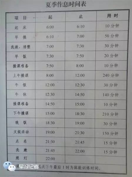 部队里有句俗话,“一个哨子一块表,搞得战士满山跑”,这个哨子和表作为计时工具,却是最先让你头疼的家伙。一张军营作息时间表,让你对军营生活有个初体验,心里打个提前量!